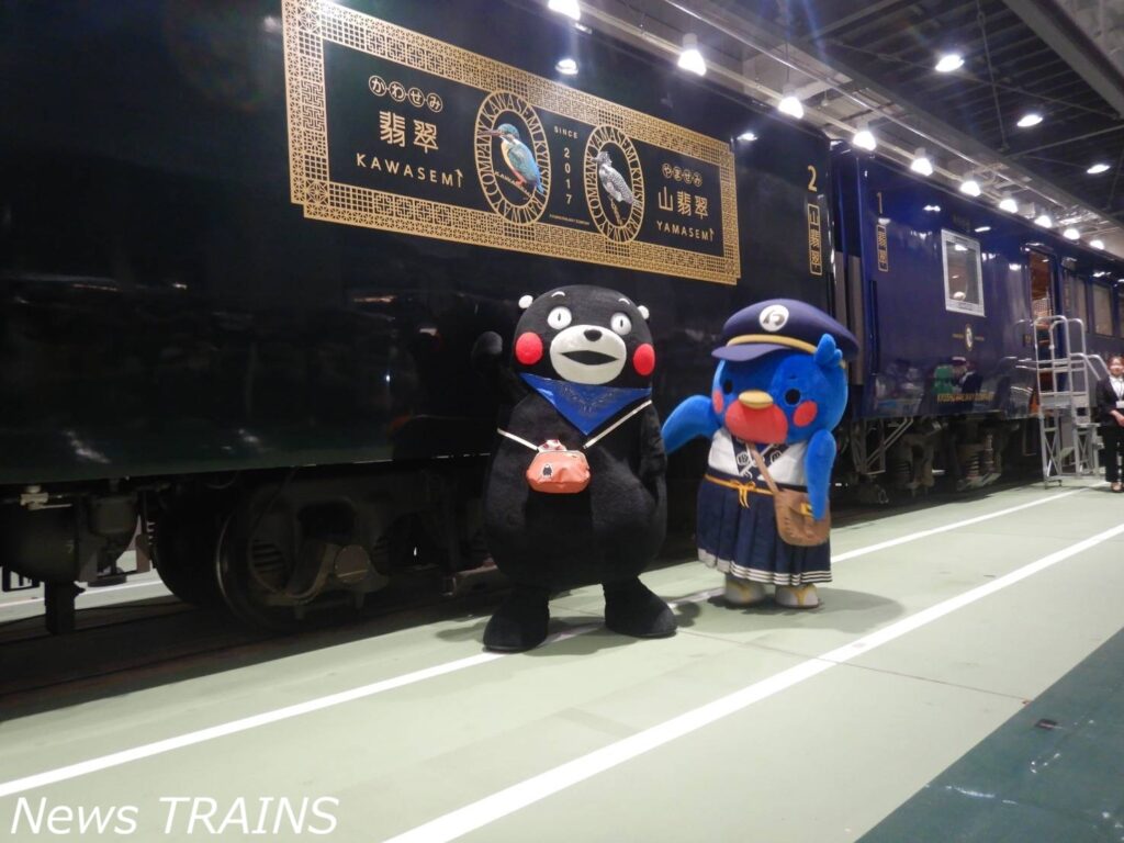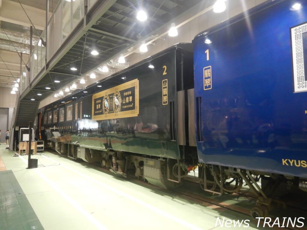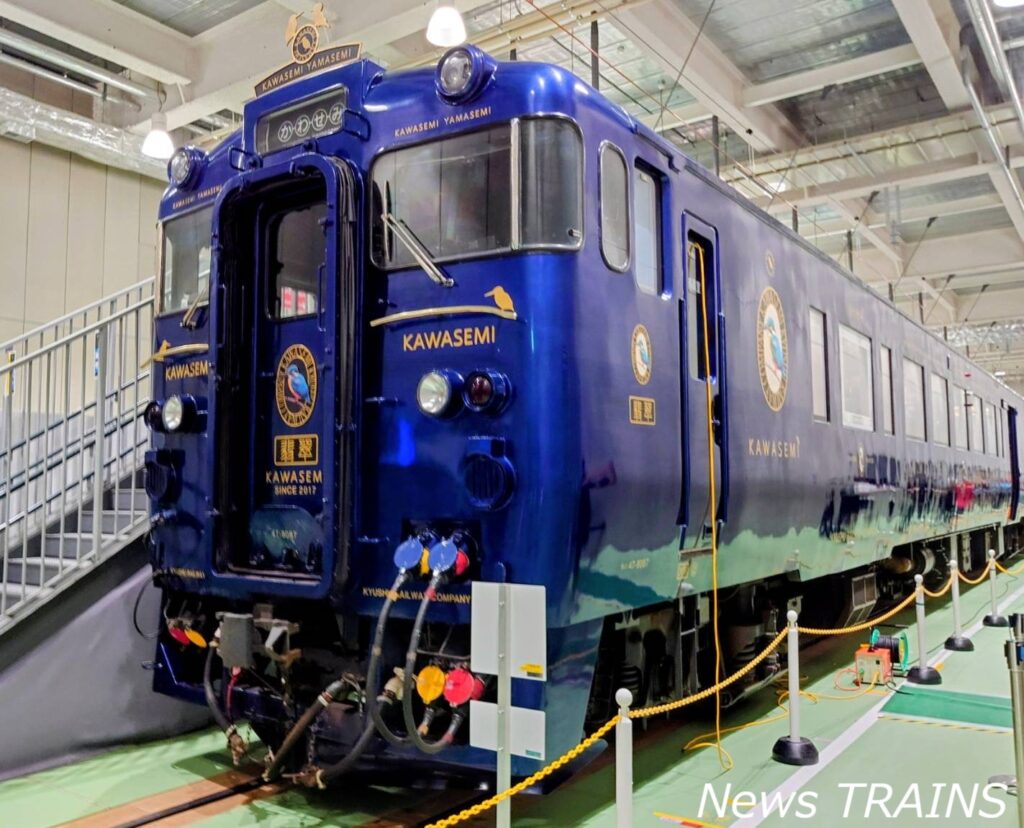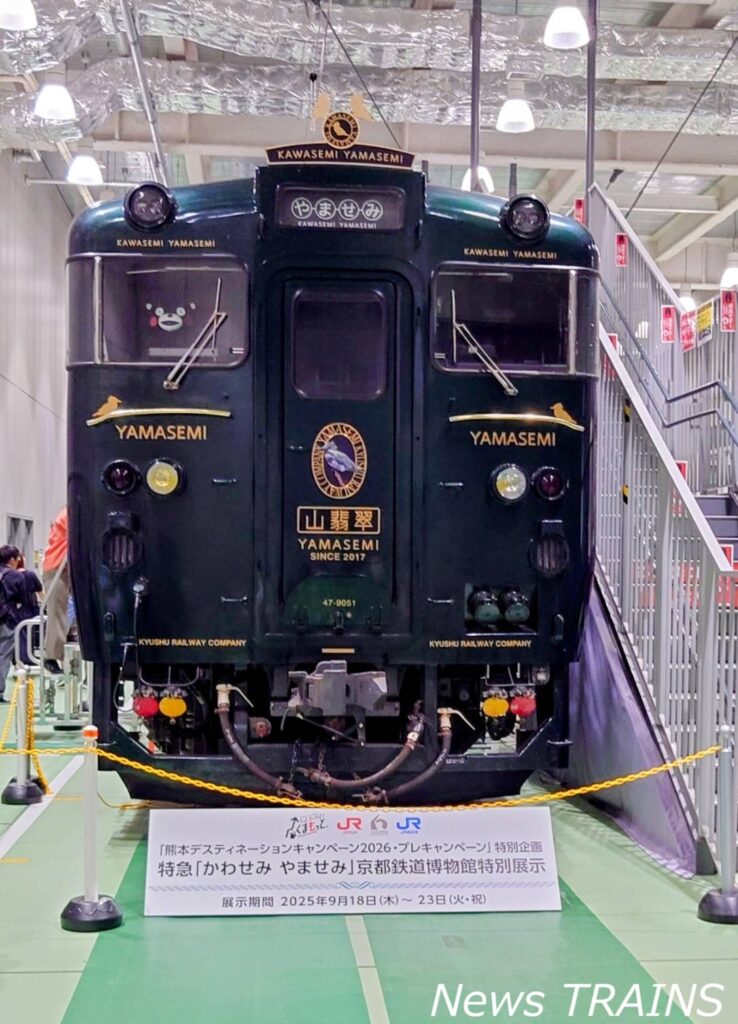 2025.09.24 Photo report News TRAINS編集部 京都鉄道博物館にJR九州のD&S列車「かわせみ やませみ」がやってきた!初展示をちょっとだけ見学してきた<report> 九州旅客鉄道(JR九州)と西日本旅客鉄道(JR西日本)・京都鉄道博物館は、特急「かわせみ やませみ」の特別展示を京都鉄道博物館において実施した。 京都鉄道博物館では、西日本旅客鉄道(JR西日本)の営業路線と繋がった引込線を活用して様々な車両の特別展示を実施しており、現役の鉄道車両が期間限定で展示されることから人気を博している。「かわせみ やませみ」の特別展示は、開催中の「熊本デスティネーションキャンペーン2026・プレキャンペーン」に合わせ実施。 館内での展示前に普段入れない留置線で撮影できる撮影会や車内公開、SLスチーム号に特別展示にあわせた特製ヘッドマークを掲出するなど特別展示に伴う様々なイベントを実施した。 なお、同館でJR九州の車両が展示されたのは初めてのことだという。「かわせみ やませみ」の特別展示は9月23日まで実施された。