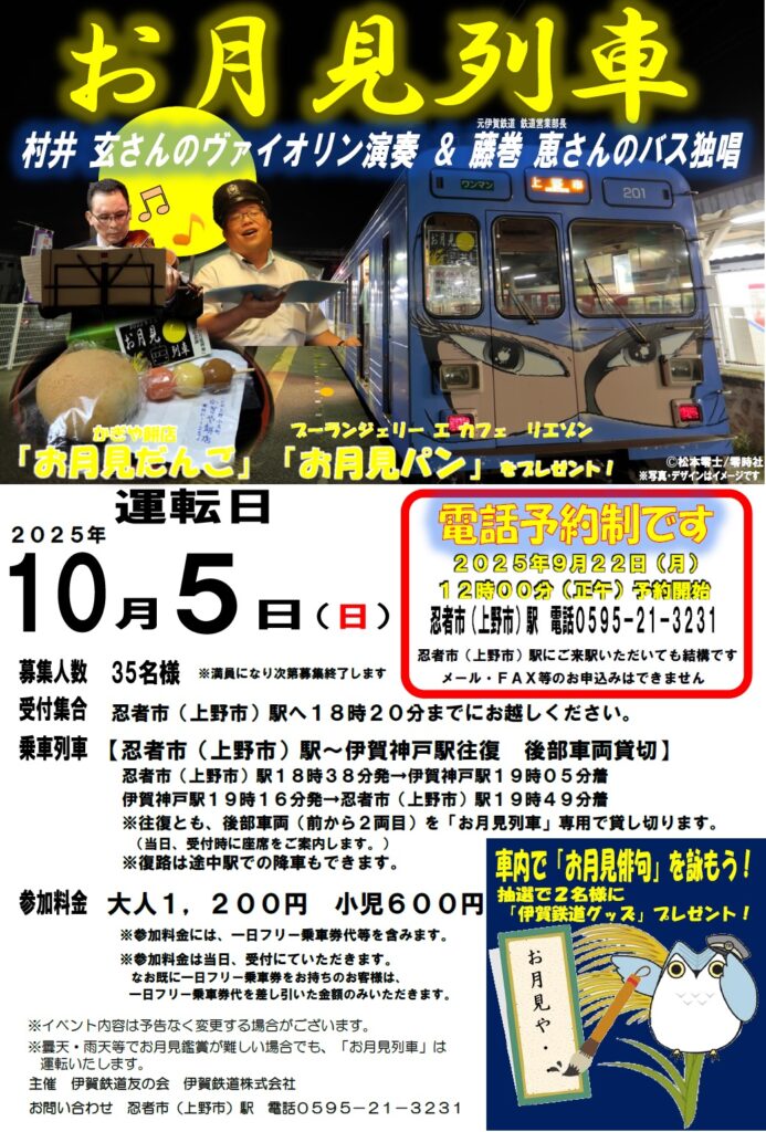伊賀鉄道は、中秋の名月(10月6日)にちなみ、車内から「お月見」を楽しめる「お月見列車」を10月5日に運転する。