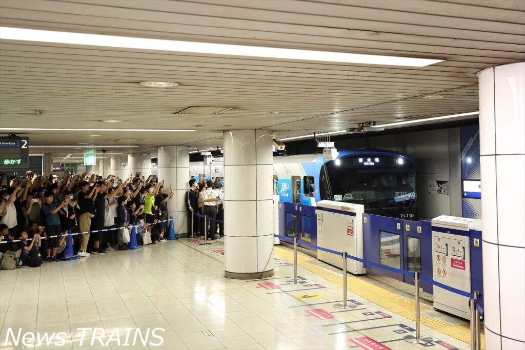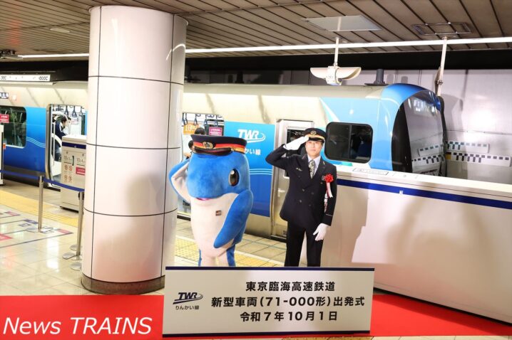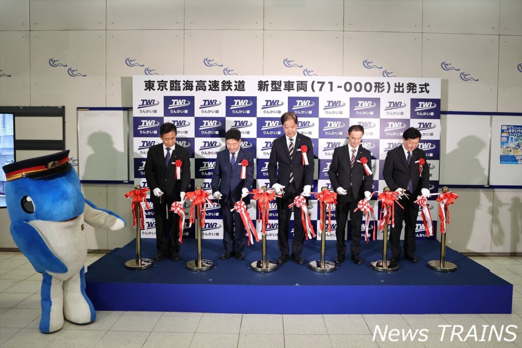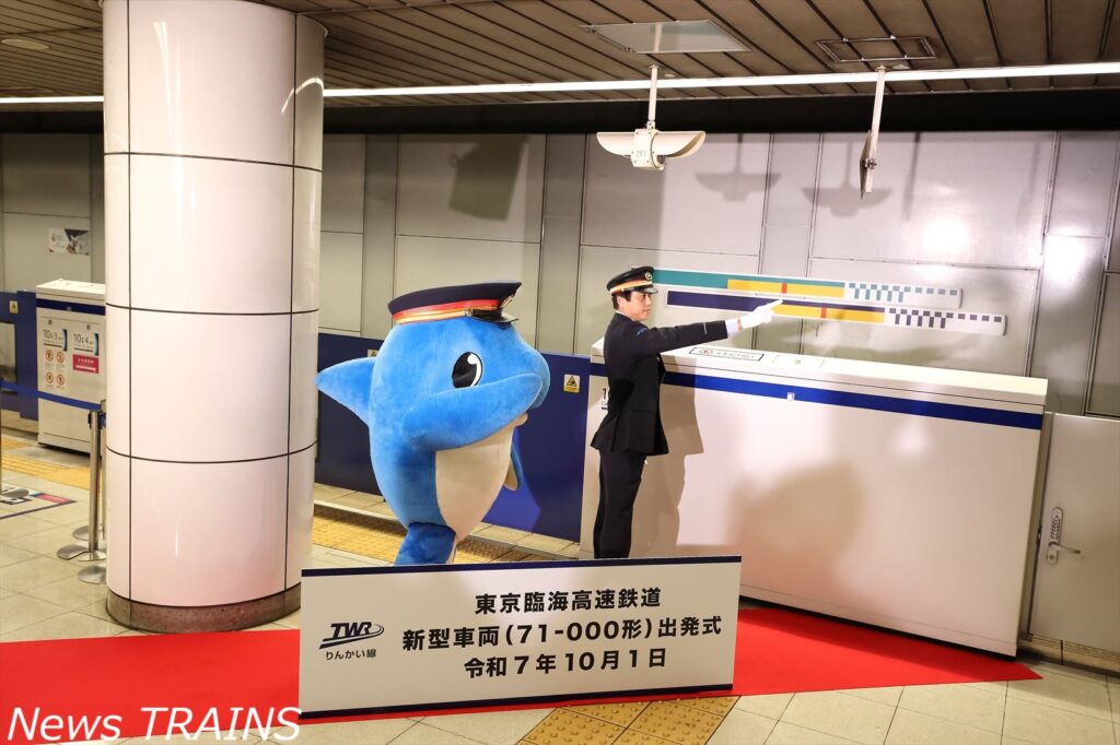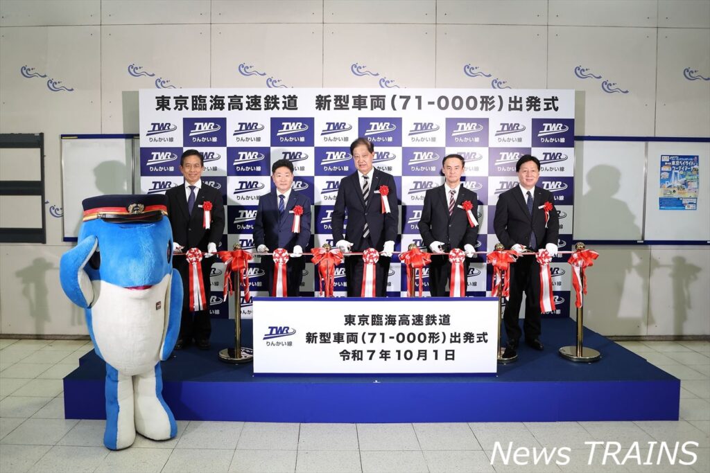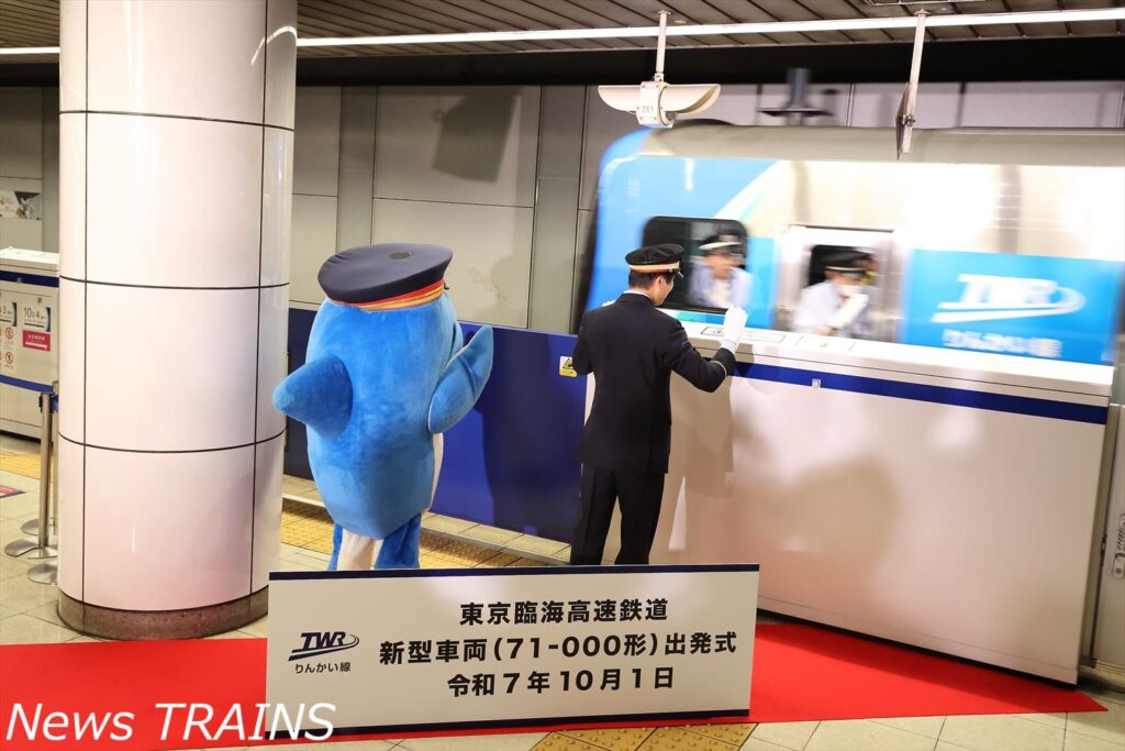 2025.10.01 Photo report News TRAINS編集部 【東京臨海高速鉄道】「優しい微笑み」が印象的な車両 りんかい線新型車両「71-000形」がデビュー<Photo report> 東京臨海高速鉄道は、10月1日、りんかい線新型車両「71-000形」の営業運転を開始し、東京テレポート駅において出発式を執り行った。 「71-000形」は、1996年3月の新木場~東京テレポート間開業以来28年間に渡り活躍してきた70-000形に代わり導入するも車両で、前面のカラーリングは、70-000形の色彩を継承しつつ、「優しい微笑み」をイメージした前面デザインとして親しみやすさを表現されている。 出発式には、西倉鉄也 東京臨海高速鉄道取締役社長、谷本俊哉 東京臨海高速鉄道常務取締役、関係者らとりんかい線イメージキャラクターりんかるら出席し、地下1F改札内コンコースでテープカットを執り行った。 「71-000形」の営業運転の初列車は、東京テレポート駅を16時07分に発車する新木場行で、初列車を見送るため多くの鉄道ファンも駆け付けていた。16時過ぎにホームに「71-000形」が入線。 飯島康之管理駅長が出発合図を送り、16時07分、警笛を鳴らし「71-000形」は新木場に向け出発した。 「71-000形」は、2027年度状半期にかけ10両8編成、全80両を導入される計画としている。【取材協力:東京臨海高速鉄道】