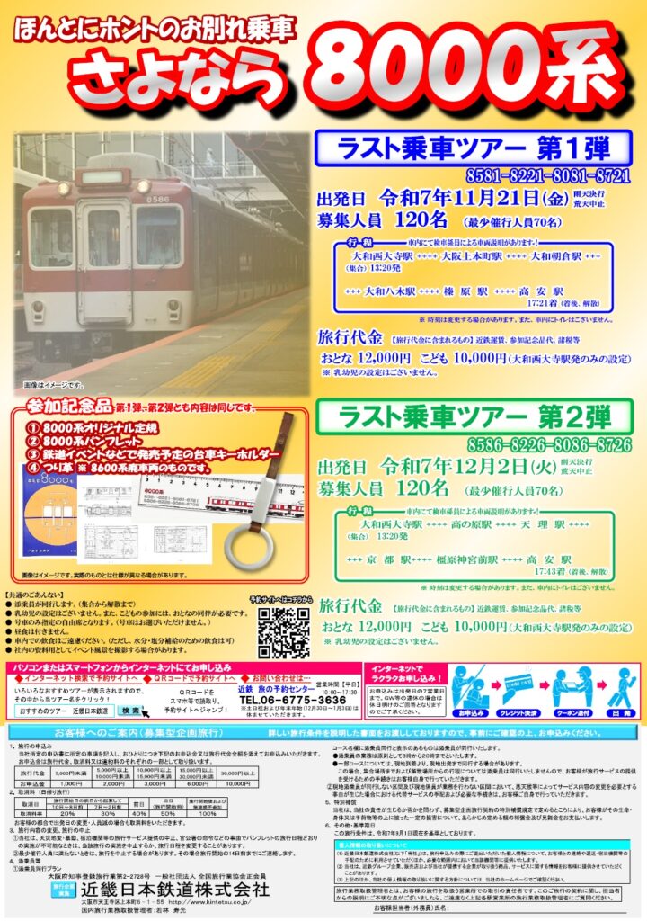 近畿日本鉄道は、「さよなら8000系 ラスト乗車ツアー」第1弾・第2弾を11月と12月に開催する。