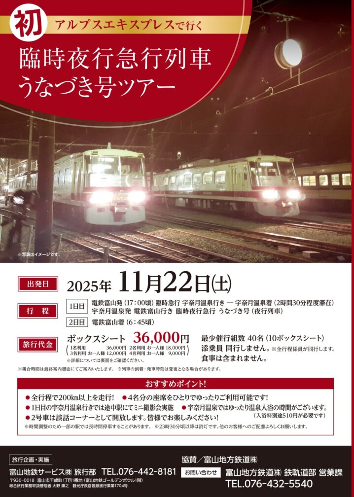 富山地方鉄道は、「臨時夜行急行列車 うなづき号」ツアーを11月22日に開催する。