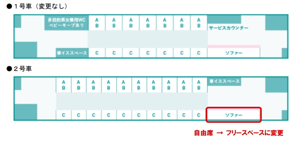 特急「海幸山幸」は、現在、日南線 宮崎駅~南郷駅間で運行する人気のD&S列車として活躍している。これまで、車内のほとんどは指定席としていたが、2号車のソファー席6席分を自由席としていたがこれを廃止し、1号車と同様のフリースペースに変更するとしている。