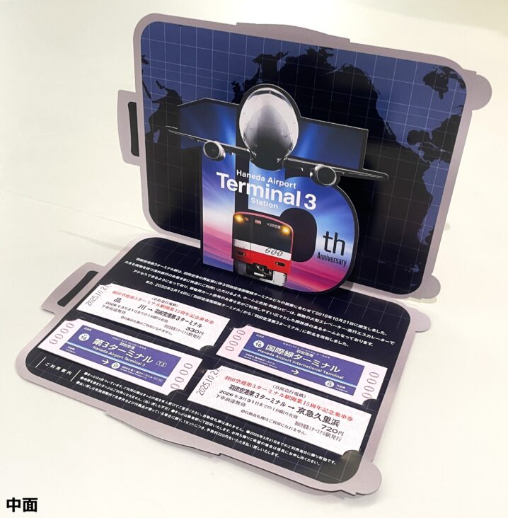 記念乗車券は、スーツケースを京急カラーにデザインした台紙に、中面に記念乗車券を配置。表紙をめくると「京急電車・飛行機」が立体的に飛び出す仕様とした。数量限定での発売となる。