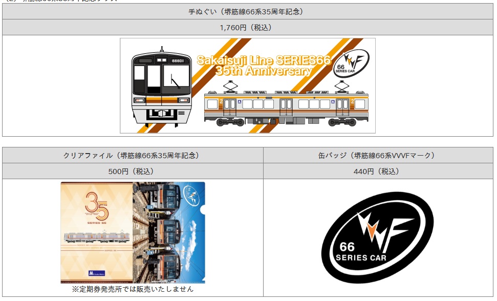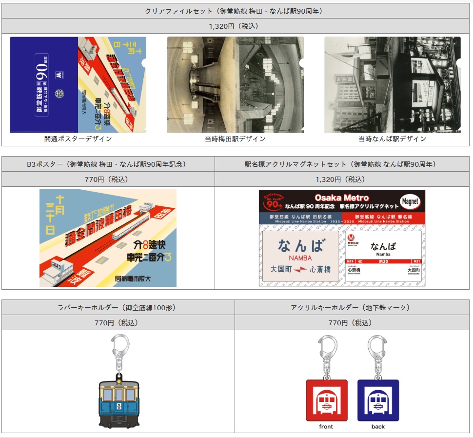 大阪市高速電気軌道(大阪メトロ)は、「御堂筋線 梅田・なんば駅90周年記念グッズ」「堺筋線66系35周年記念グッズ」を10月22日より販売を開始する。