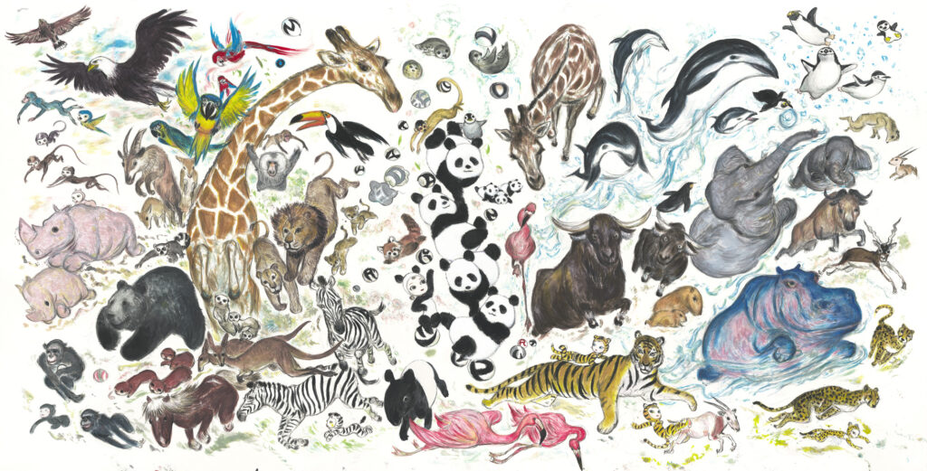 新たなラッピングデザインは、アーティストの天野喜孝氏が基本デザインを描き下ろしており、『多様な人、動物、自然が調和しながら生きる未来の世界を表現。すべての命がいきいきと輝く理想郷をテーマに、「Utopia(ユートピア)〜いのちの美しさに気づく場所〜」』というコンセプトで制作したという。
