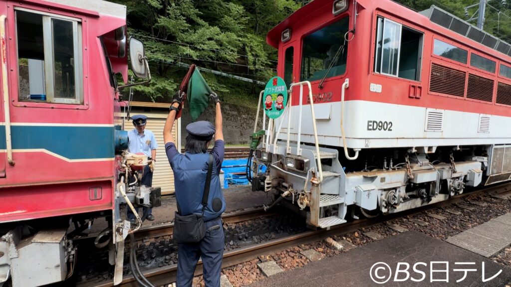 急勾配の区間は、巨大な歯車で登り坂をサポートするアプト式列車に。連結に車内アナウンスに、安全確認に…忙しすぎる車掌さんに、西村さんも最敬礼する。