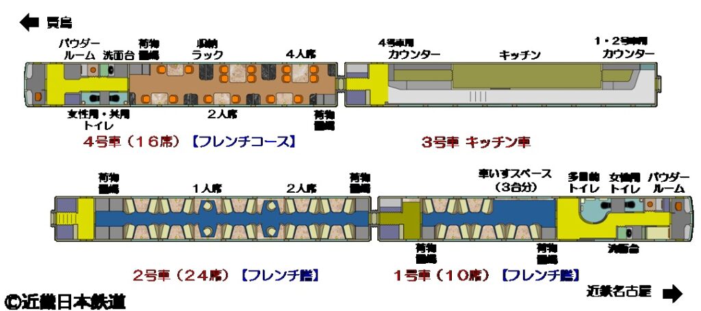 3号車は、1両全体がキッチン車に。座席数は、4号車(フレンチコース)が4人席×2卓、2人席×4卓 計16席。1・2号車(フレンチ膳) は2人席×15卓、1人席×4卓 計34席。合計50席の全席座席指定になるという。