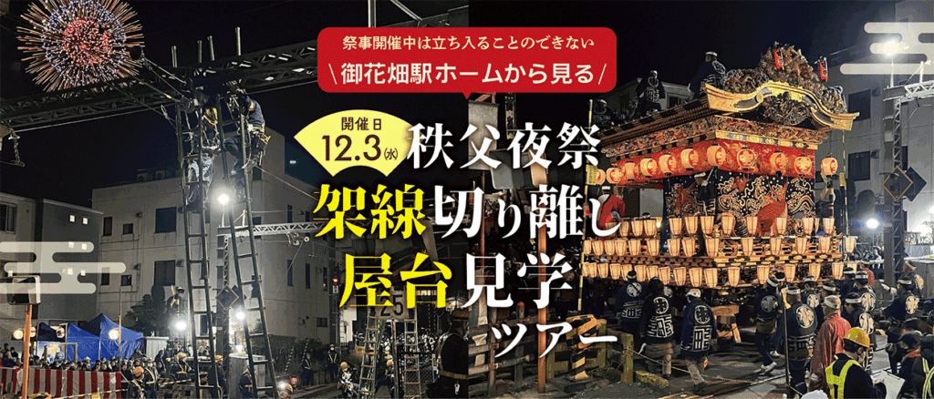 《行 程》秩父駅受付(18:20~18:40)→秩父駅→(列車移動)→御花畑駅19:20頃着予定… <御花畑駅ホーム特設スペースにて架線切り離しや屋台の通過を見学>…現地解散 21:00頃