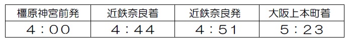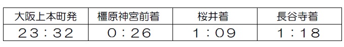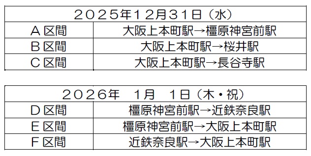 初詣列車は2つのコースを設定し、12月31日の23時32分に大阪上本町駅を発車後、途中の橿原神宮前駅、桜井駅に停車して長谷寺駅まで運行。1月1日は橿原神宮前駅を4時00分に発車後、途中の近鉄奈良駅に停車し大阪上本町駅まで運行する。