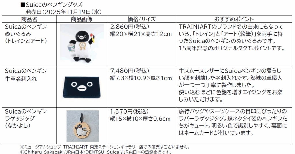 ・Suicaのペンギン ぬいぐるみ(トレインとアート) ・Suica のペンギン 牛革名刺入れ ・Suicaのペンギン ラゲッジタグ(なかよし)