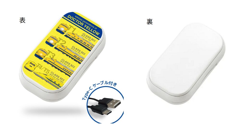 モバイルバッテリーとしても使えるUSB充電式カイロ。歴代ドクターイエローの正面・側面のデザインはインパクト大。温度は3段階に調整可能(弱40℃、中45℃、強50℃)