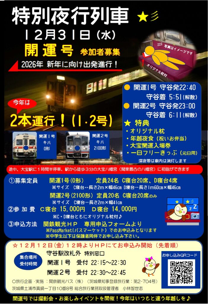 2025年の「開運号」は2本を運行することが発表された。開運1号は「キハ0形」、開運2号は「キハ2100形」を充当。新年の幕開けを過ごせる夜行列車となっており、常総線全線を走行。深夜帯は車内を消灯して夜行運転を行うほか、途中駅では、撮影会や除夜の汽笛吹鳴などのイベントを実施する。