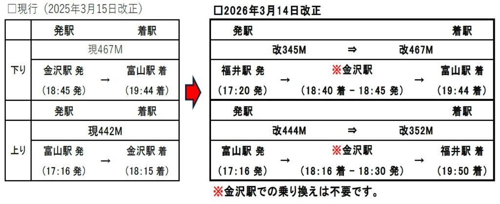 2025.12.13 ニュース News TRAINS編集部 福井~石川~富山間の北陸三県を渡る直通列車が15年ぶりに復活 北陸三県の3セクで2026年3月のダイヤ改正から あいの風とやま鉄道・IRいしかわ鉄道・ハピラインふくいの3社は、2026年3月14日実施するダイヤ改正の概要について発表した。 ダイヤ改正では、夕方時間帯に福井~富山間直通運行の普通列車上下各1本、計2本を新設。同区間を直通する普通列車は15年ぶりの運転となる。 上下線とも乗り換えなしで移動が可能となり、利用者の利便性向上を図るとしている。 ※画像はイメージ※