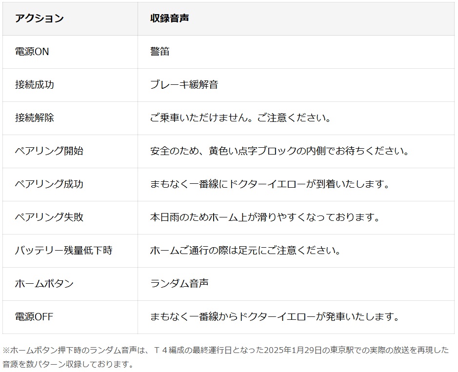 また、企画のためにJR東海が完全監修したオリジナルサウンドを搭載。全社競技会である『The Supreme 2024~新幹線技術力No.1競技会~列車監視部門』でNO.1を受賞した現役駅員の撮り下ろし音声を収録。引退したドクターイエロー車両から収録した警笛音やブレーキ緩解音も搭載した。