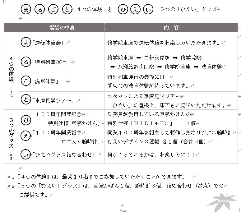 叡山電鉄は、開業100周年を記念し、「~開業100周年記念~ 100万円福袋『まるごとひえい』」の販売を開始した。