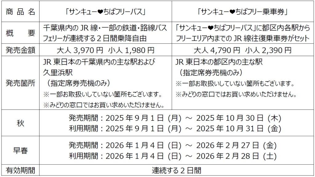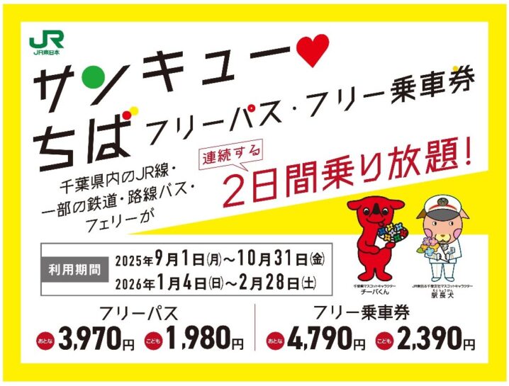 千葉県と県内の交通事業者は、早春の千葉をお得に旅するきっぷ「サンキュー❤ちばフリーパス」と東京都区内からの乗車券とフリーパスがセットになった「サンキュー❤ちばフリー乗車券」を2026年1月4日から発売する。