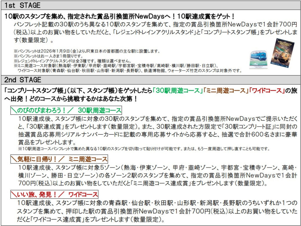 10駅のスタンプを集め、指定された賞品引換箇所NewDaysにパンフレットを提示。1会計700円(税込)以上の買い物で「レジェンドトレインアクリルスタンド」と