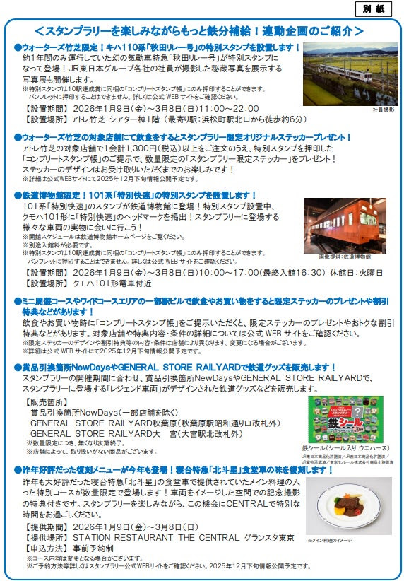 そのほか、連動企画としてウォーターズ竹芝において、特別スタンプを設置の設置や写真展を開催。鉄道博物館では特別スタンプを設置の設置や展示車両にヘッドマークを掲出する。