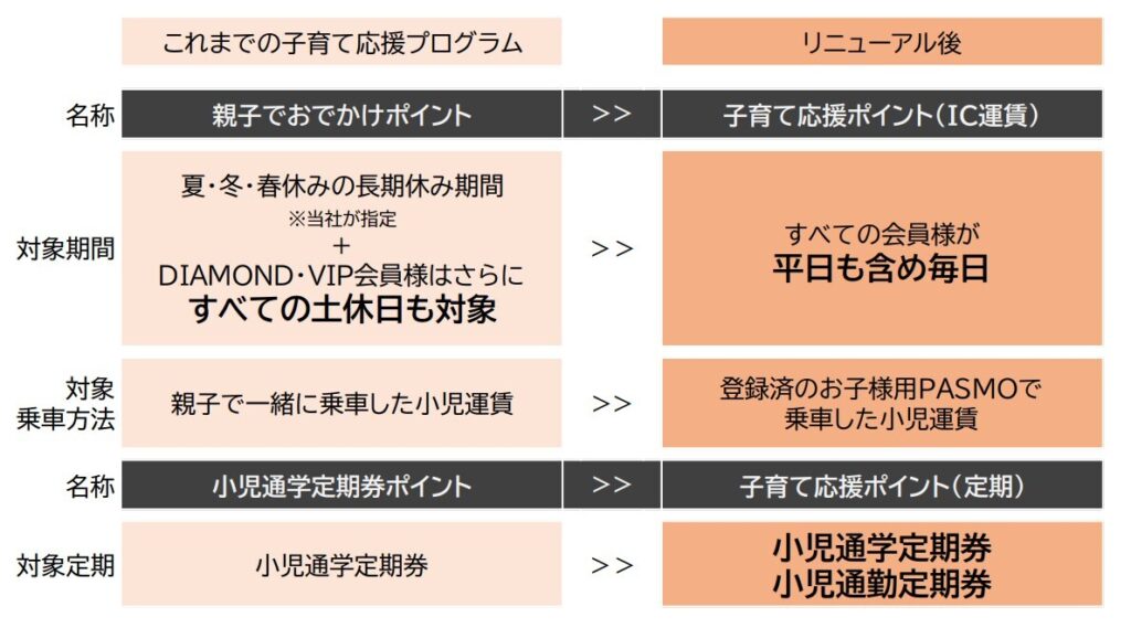 これまでも東武鉄道は、夏・冬・春の長期休み等の期間限定で、親子で一緒に乗車した場合に限り小児運賃相当額のポイントを還元する「親子でおでかけポイント」や小児通学定期券をポイント還元する「小児通学定期券ポイント」を実施していた。今回サービスのリニューアルにより、おでかけ、日々の習い事や塾への利用など、様々なシーンでお得に利用してもらうことで子育て世代のご負担を軽減や、沿線観光地やレジャー施設への旅行や行楽など、子供たちの体験機会の増大を目指すとしている。