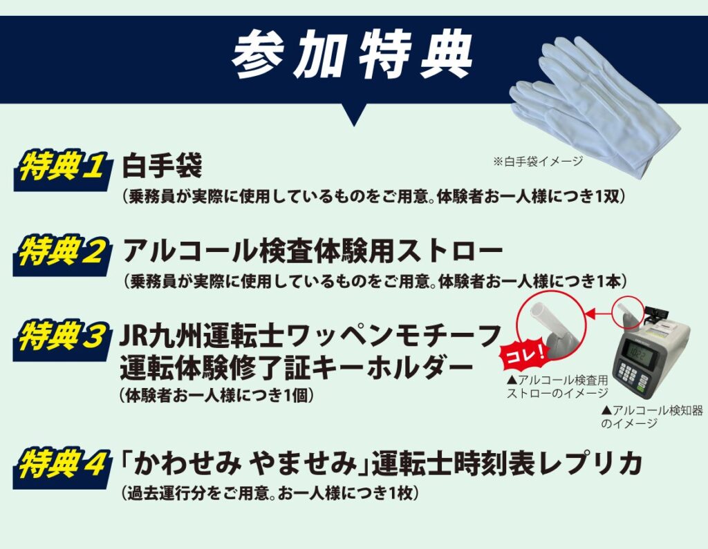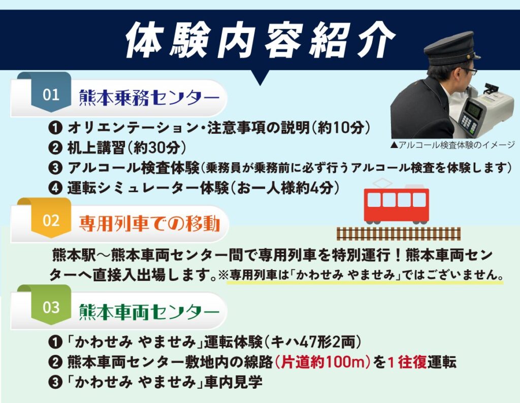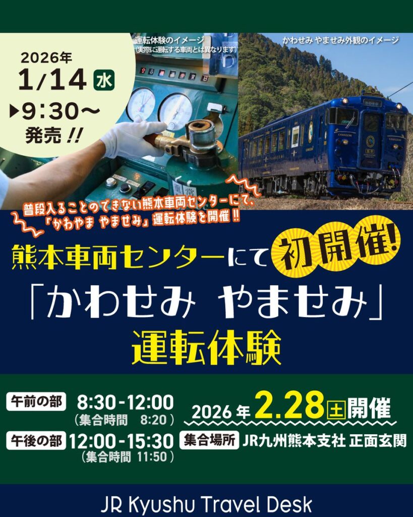 体験では、熊本乗務センターでオリエンテーションや机上講習、アルコール検査を行った後、運転シミュレーター体験を実施。熊本駅~熊本車両センター間を専用列車で移動した後、熊本車両センターにおいて「かわせみ やませみ」(キハ47形2両)を使用し、片道約100メートルのを1往復の運転体験を行う。また、「かわせみ やませみ」車内見学も。実際の電車を動かす本格的な体験が可能な「かわせみ やませみ」運転体験に参加してみてはどうだろうか。参加には事前申込が必要となる。