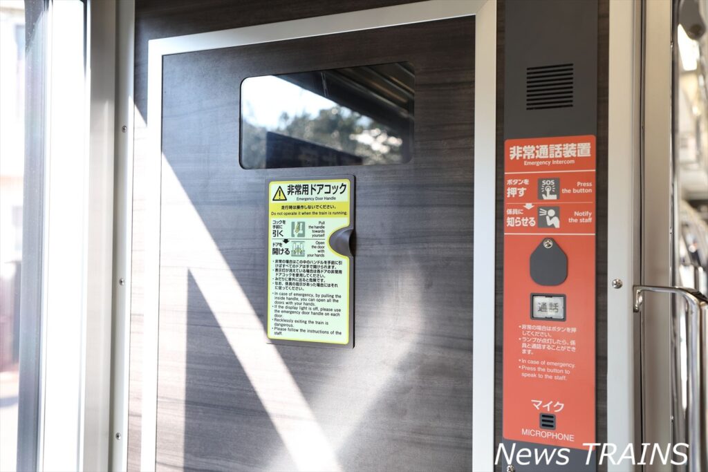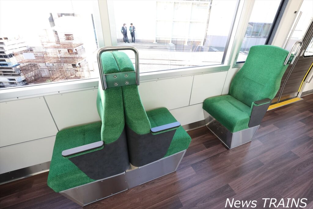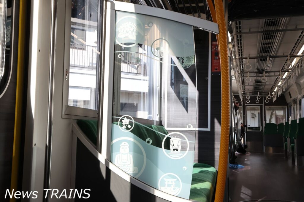 また、座席や床の色は、鎌倉・江ノ島をイメージした3色のテーマカラーを採用し、編成によって異なるものに。今回、お披露目された車両は、「タンコロ」から歴代車両へと続く伝統色『江ノ電グリーン』が採用された。また、安全・安心・快適性の向上を目的として、車内防犯カメラ、車両側面カメラ、通話型の非常通報装置を設置。バリアフリー対応や多言語放送に加え、窓に鉄道車両で初採用というフィルムを貼付し、飛散防止を図るとともに眩しさを抑え、色鮮やかな景色を楽しめるようになています。