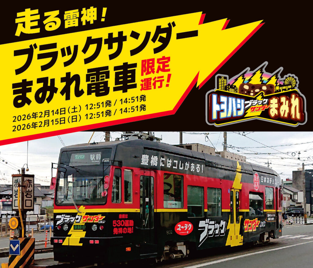 豊橋鉄道は、有楽製菓が「ブラックサンダー」の主な生産拠点のある愛知県豊橋市にて展開するバレンタインイベント「豊橋ブラックサンダーまみれ」に合わせ、特別連動企画を実施する。