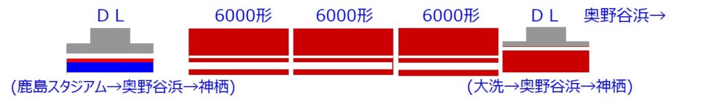 列車は大洗から鹿島スタジアムまではディーゼル機関車単機牽引、鹿島スタジアムでは最後尾にもう一台機関車を増結し、通常では旅客運用が無い貨物線の終端駅である奥野谷浜までプッシュプル運行、奥野谷浜までDLが牽引する。