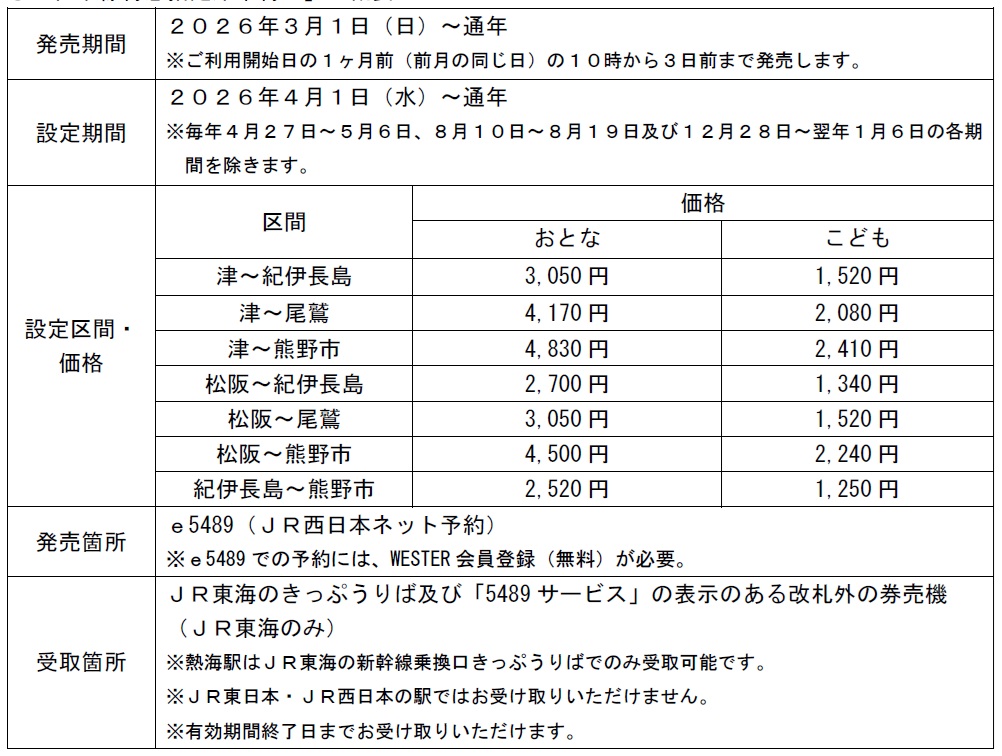 特急「南紀」の普通車指定席を発車日の3日前までにe5489(JR西日本ネット予約)で予約することで、お得に乗車可能なきっぷを新たに発売。乗車前に駅で発券が必要