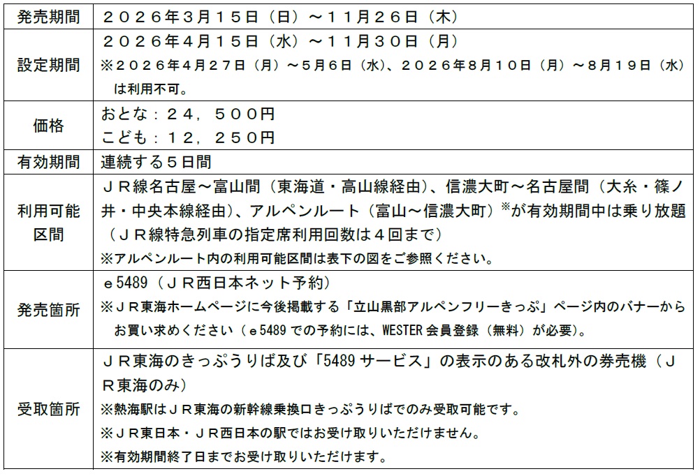 「立山黒部アルペンルート」を、ロープウェイや電気バスなどを乗り継いで利用できる商品として2025年度まで発売していた「立山黒部アルペンきっぷ」を、2026年度は価格や効力を以下の通り改定して「立山黒部アルペンフリーきっぷ」として発売