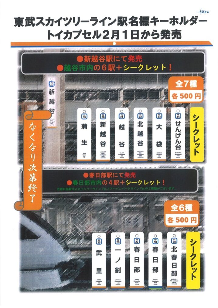 2026.01.31 グッズ News TRAINS編集部 【東武鉄道】大人気のトイカプセルに東武スカイツリーライン(春日部地区・越谷地区)の駅名標キーホルダーが登場!2月1から限定発売! 東武鉄道は、東武スカイツリーラインの駅名標キーホルダーを2月1日から発売する。 大好評の駅名標キーホルダーに東武スカイツリーラインが登場した。今回は、春日部地区各駅4駅とシークレット1駅の全6種類、越谷地区各駅6駅とシークレット1駅をプラスした全7種類をキーホルダーにし、トイカプセル販売機で1回500円(税込)で、春日部駅と新越谷駅で発売する。