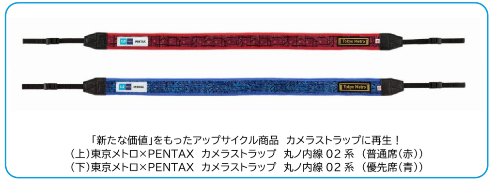 カメラストラップは普通席・優先席の全2種類。東京メトロの制服に採用される袖章タグやロゴが入ったオリジナル織ネームも取り入れ、商品化した。また、当初の企画時点ではリコーイメージングの販売ルートで普通席・優先席各150本の計300本を製作・販売予定であったところ、生地の裁断を行った際に想定よりも多く製作できることが判明したことから、SDGsの取り組みとして生地を廃棄することなく活用し、時期を分けて東京メトロでも販売することになったという。販売期間は2回に分け、販売を行う。