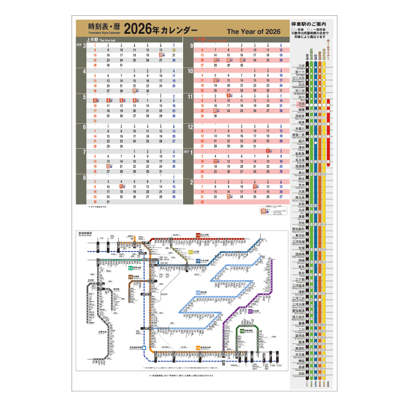 カレンダーは、東海旅客鉄道(JR東海)の在来線設置駅に設置されている時刻表をモチーフにしたカレンダーで、右側の「停車駅のご案内」には、大垣駅・東海道線上り方面(平日)の駅時刻表デザインを採用。情報量やレイアウト、配色に至るまで、実物の駅時刻表らしさを追求したという。下段には、JR東海の在来線車両内などでおなじみの路線図を掲載。沿線の広がりや路線同士のつながりを感じられるデザインとした。また、JRグループのダイヤ改正が行われる2026年3月14日だけは、他の日付と異なる表記とした。