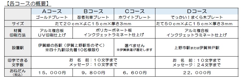 伊賀鉄道を支援いただけるオーナーを募集し、そのオーナーの名前やメッセージを記載したプレートを、伊賀上野駅以外の伊賀線各駅構内(四十九駅は先着10名限り)のまくら木に設置する。