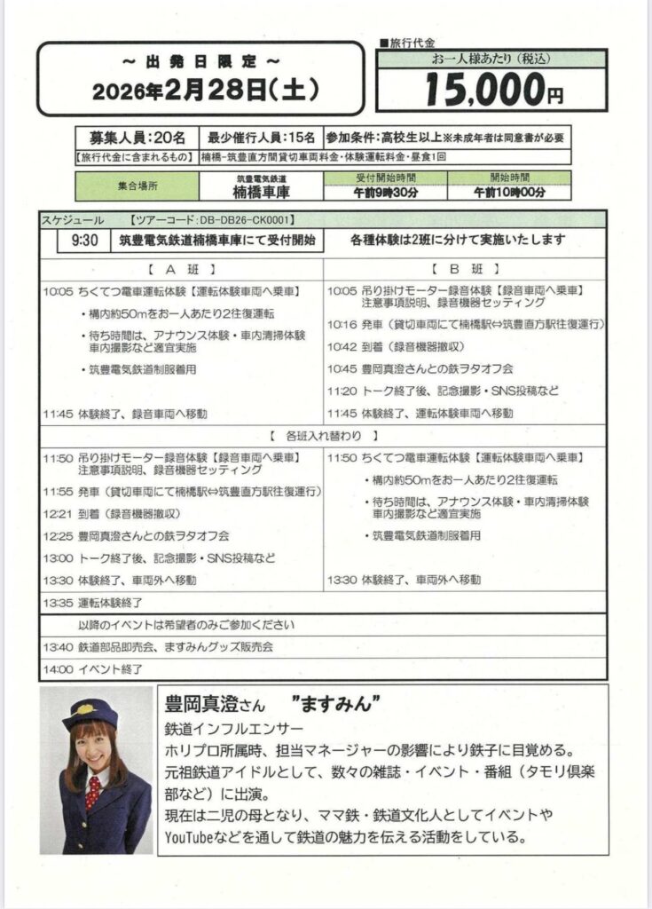 ツアーは、筑豊電気鉄道の3000形をリアルに体感できる「運転体験」(1人2往復、片道約50m。1日1往復終了後交代)のほか、希少な吊り掛けモーターの生音を録音できる「録音体験」や鉄道インフルエンサー豊岡真澄さんとの「鉄ヲタオフ会」、鉄道部品即売会、ますみんグッズ販売会などを実施する。