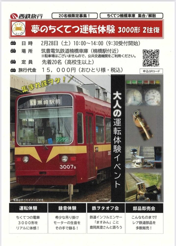 西鉄旅行は、『集まれ鉄ヲタ!夢のちくてつ運転体験』を2月28日に開催する。