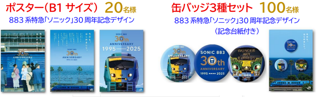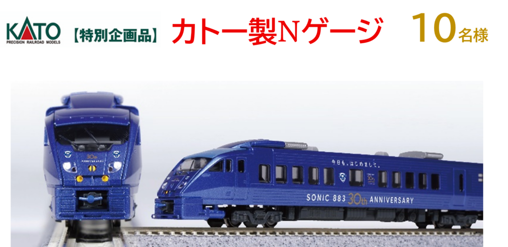 キャンペーン期間中に、QRチケレスを利用し、ソニックの運行区間(博多駅~佐伯駅)で一人あたり片道1,500円以上の利用者を対象に抽選で合計130名に「カトー製Nゲージ」などソニック30周年グッズをプレゼントする。