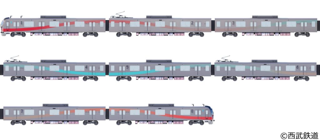 1編成の8両全ての車両でカラーリングが異なるデザインは、西武鉄道の車両として初の試みだという。