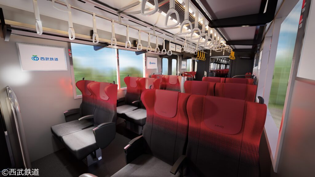 車内は、リクライニングシート機能付きの座席を配置し、座席色は車体のデザインに合わせたレッドとオレンジを採用し、統一感のある車内空間を演出。また全席コンセントやカップホルダーなどを設置。すべての車両で「SEIBU FREE Wi-Fi」をの利用が可能で、トイレも備えた車両になるという。照明の色温度にもこだわったといい、暖かい光の調整を施したもの。床面、壁面には落ち着いた色調を採用しており、「心からリラックスできる空間を実現」しているという。