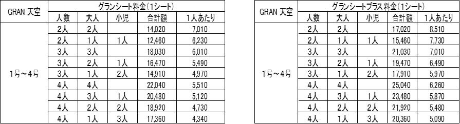 4号車の「グランシート」「グランシートプラス」は、運行時間に応じた食事と沿線にゆかりのあるソフトドリンクやアルコール飲料をフリードリンクで楽しめるプラン『モーニングプラン:GRAN 天空1号』、『ランチプラン:GRAN 天空2号/3号』、『アフタヌーンティープラン:GRAN 天空4号』を設定したほか、食事なしのワンドリンク付きのプラン『ワンドリンクプラン』を提供する。
