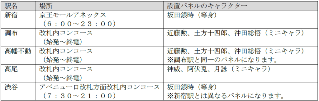 京王線・井の頭線の5駅に、コラボ描きおろしイラストおよび描き起こしミニキャライラストを用いたキャラクターパネルを設置。