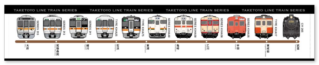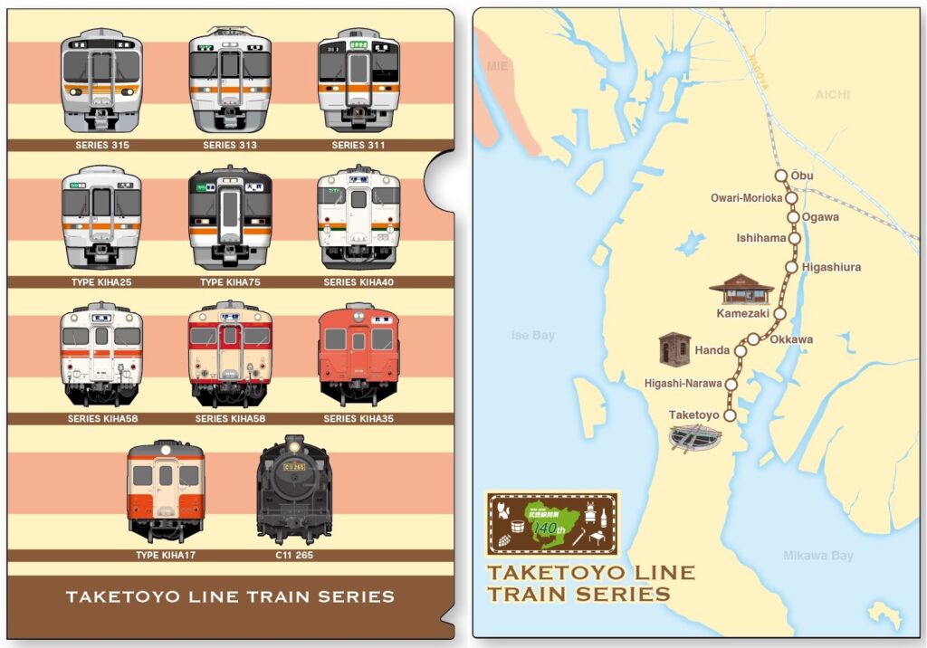 1866年(明治19年)3月1日に開業した武豊線。企画は、武豊線にゆかりのある歴代車両だけでなく、日本最古の現役駅舎といわれる亀崎駅の駅舎、半田駅前に保存されているSLや油庫、旧武豊港駅の転車台など、沿線に今も残る歴史的な駅や建造物にも着目。鉄道そのものだけでなく、地域の発展とともに積み重ねられてきた時間や記憶を、多角的なモチーフで表現した。さらに、武豊線の乗務を担当するJR東海・名古屋運輸区の社員がデザインしたロゴやアイデアを用いたグッズもラインナップした。