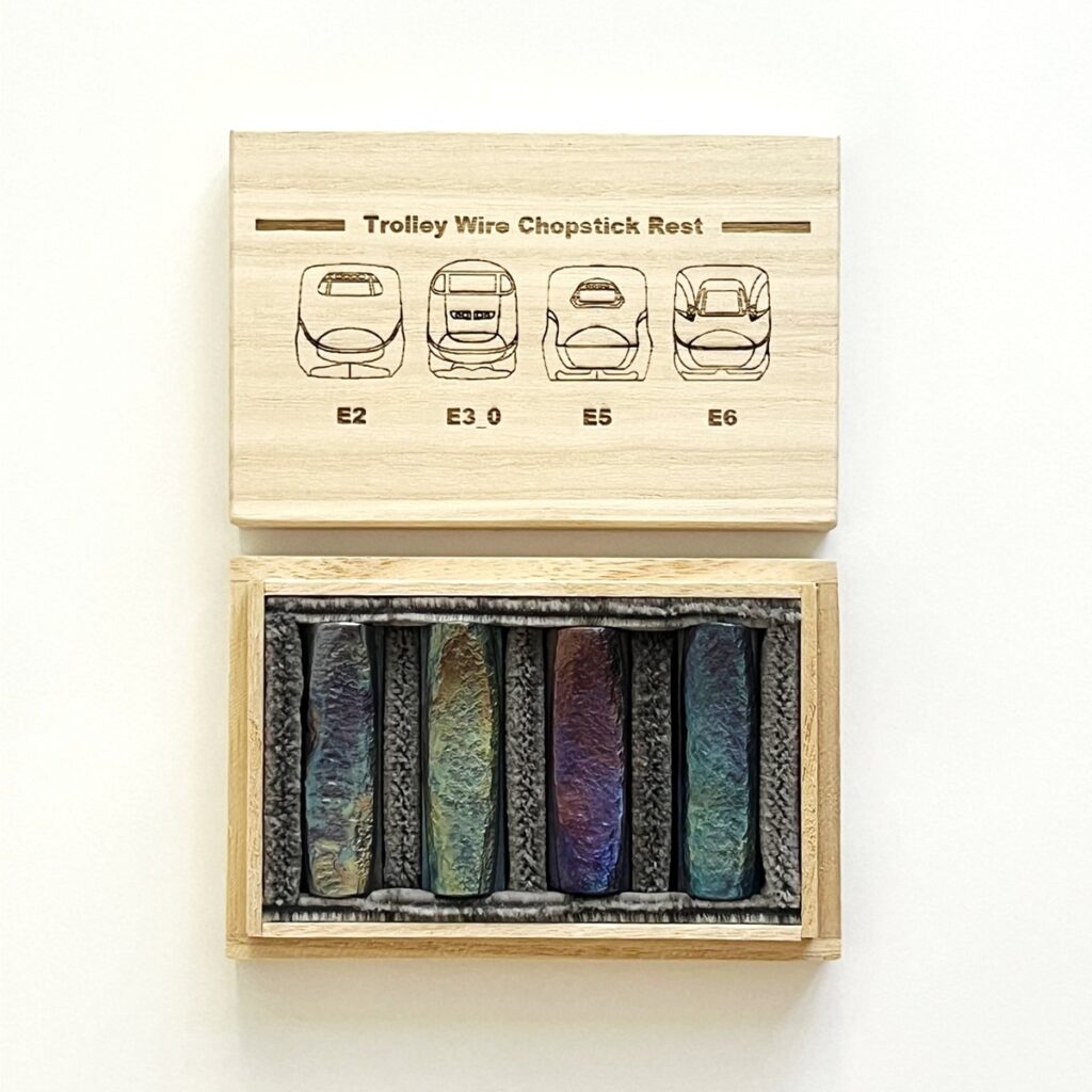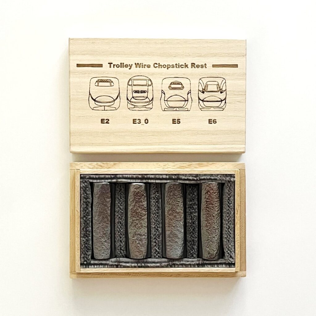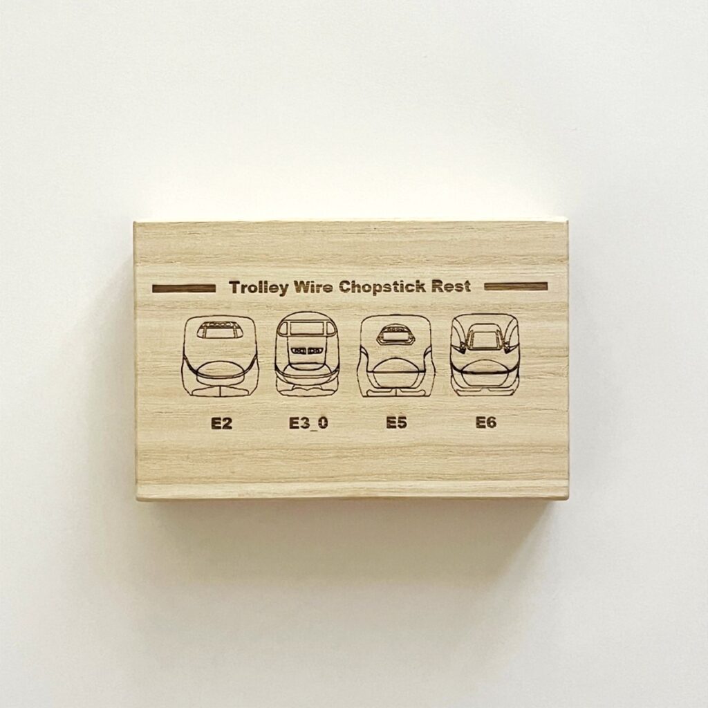 そのほか、「東北新幹線トロリ線箸置き」は、東北新幹線古川~仙台間を実際に走行していたE2系・E3系0番代・E5系・E6系車両のオリジナルデザインの刻印を施し、E5系新幹線座席シートを敷いた特別仕様の桐箱でお届けする。