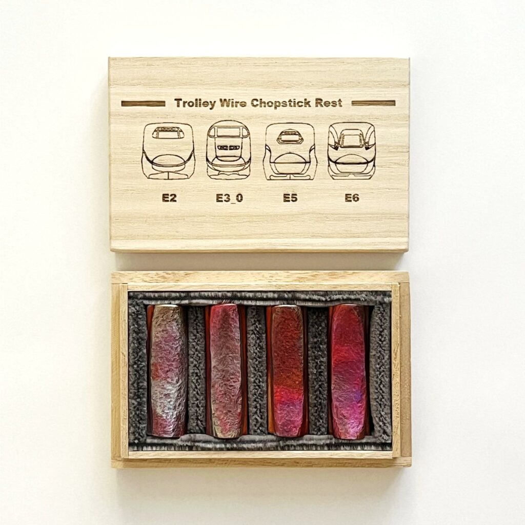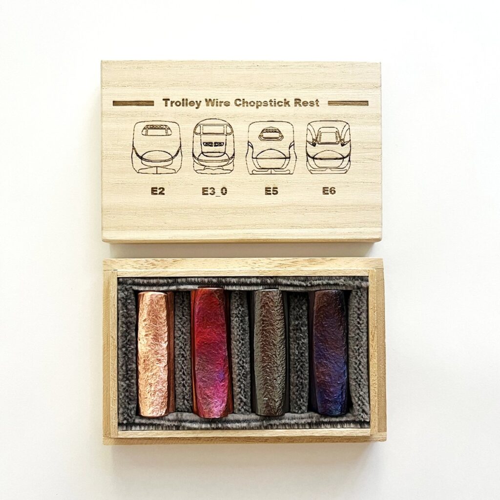 新商品は素・炎・染・炎染・全色セットの5種類で、それぞれの仕上げ方法により異なる変化を見せる銅ならではの特徴を楽しむことが可能だ。貴重なトロリ線をリメイクした箸置きを手にしてみてはどうだろうか。