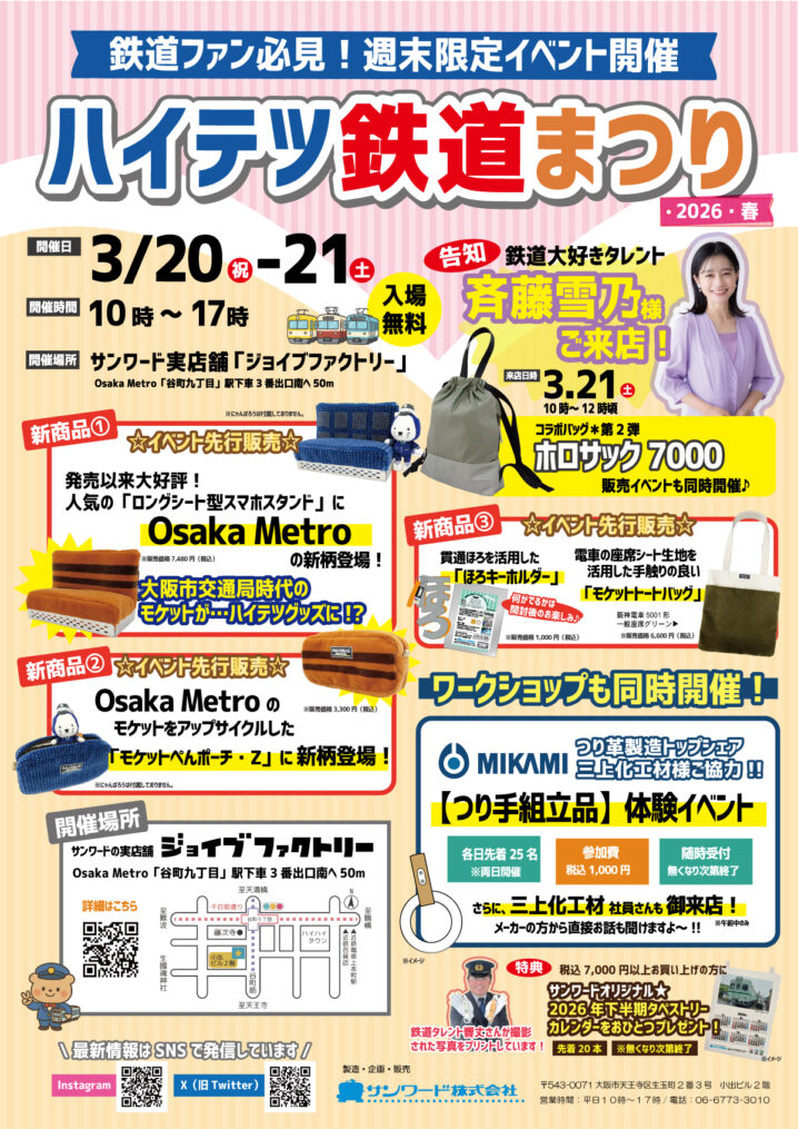 2回目の開催となるイベントは、Osaka Metroや阪神電車の座席シート生地を使用したアイテムや貫通ほろ使用のキーホルダーなど新商品の実店舗先行販売のほか、三上化工材の部材を使用した「つり手組立品」体験イベントを実施。また、21日には鉄道タレントの斉藤雪乃さんの来店が予定され、斉藤雪乃さんとのコラボバッグ第2弾「ホロサック7000」の販売イベントを同時開催する。
