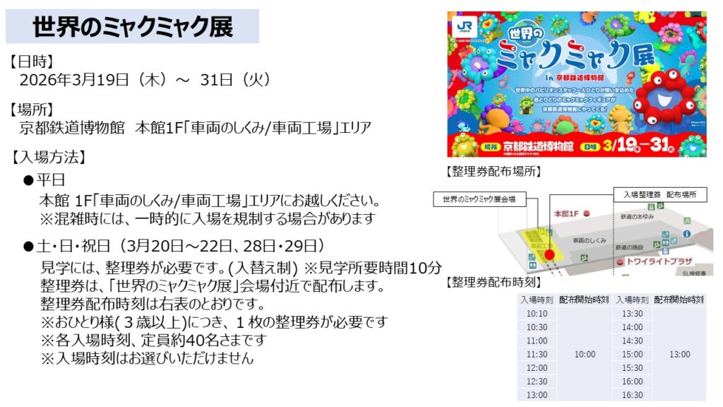 京都鉄道博物館において、「大阪・関西万博」に関連したイベントがスタートし、関連イベントとして『世界のミャクミャク展 in 京都鉄道博物館』が開催されている。