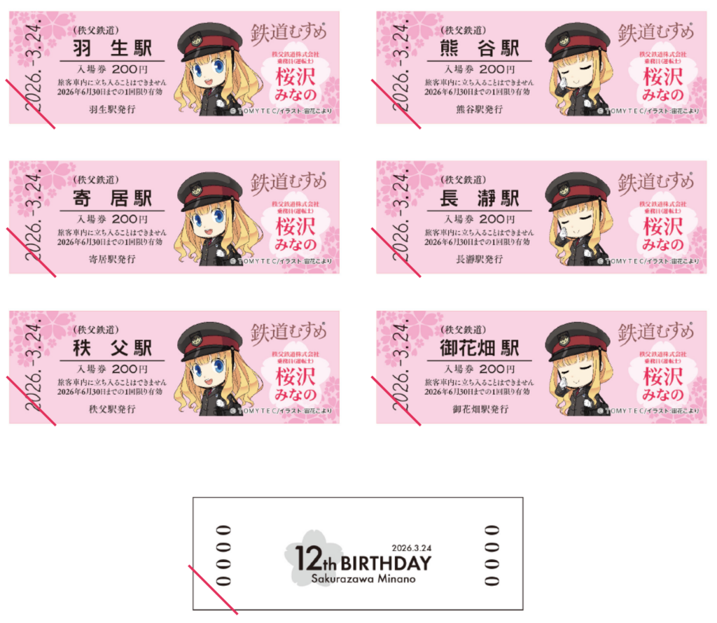 秩父鉄道は、鉄道むすめ「桜沢みなの」の12回目のバースデーを祝し、「SL桜沢みなのバースデーエクスプレス」の運行や、記念入場券と新グッズを販売する。