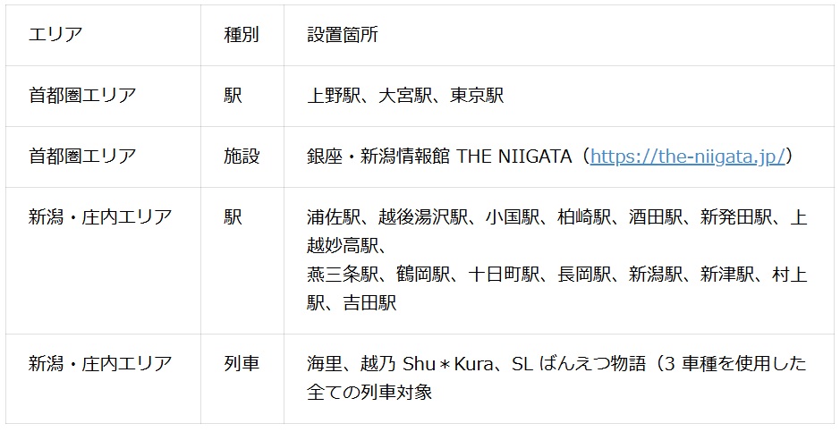 《設置箇所》首都圏エリア:駅3箇所・施設1箇所/新潟・庄内エリア:駅15箇所・列車3車種 全22箇所