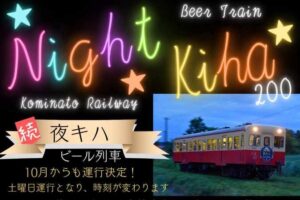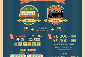 小湊鐵道は、9月まで発売をしている『夜キハ』について、好評につき10月から12月発も『続・夜キハ』として追加運行することを発表した。 「キハ200」の車内を特別仕様に変更し、おつまみ弁当+生ビール、ハイボール、焼酎水割り…