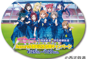 西武鉄道は、「ラブライブ!サンシャイン!!×西武鉄道・伊豆箱根鉄道 Aqours9周年記念合同キャンペーン」のラッピングトレインを4月28日から運転する。 『ラブライブ!サンシャイン!!』に登場する9人組スクールアイドル…